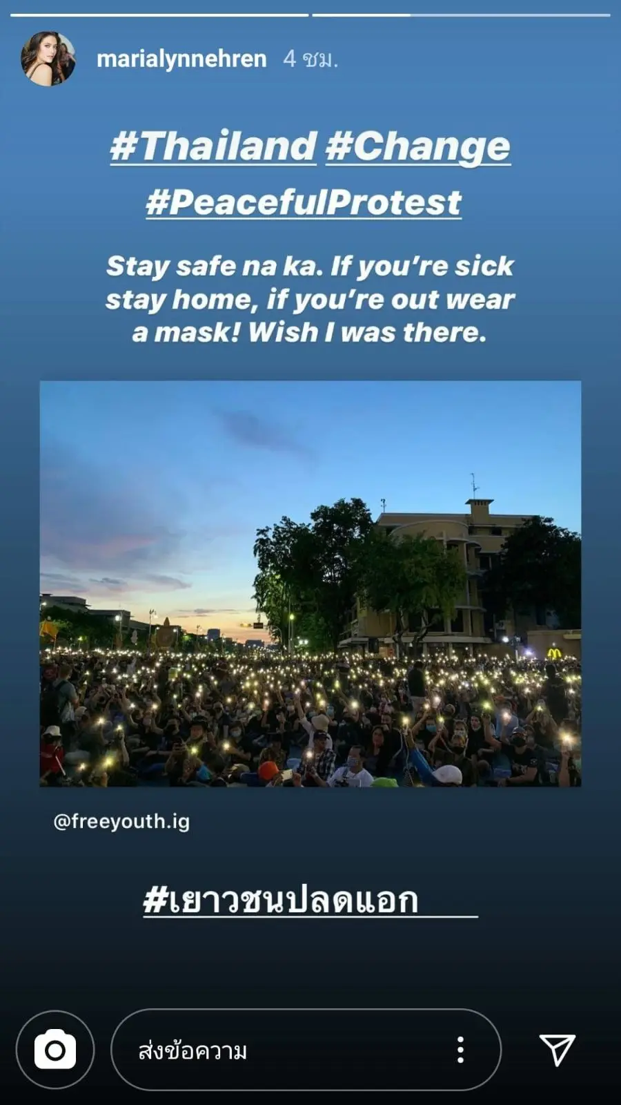นางงามอย่าง มาริญา ก็ได้โพสต์ไอจีสตอรี่ ประกาศจุดยืนอยู่ข้างทีมเยาวชนปลดแอกด้วย พร้อมแฮชแท็กระบุว่า #Thailand #Change #PeacefulProtest พร้อมข้อความด้วยว่า "ขอให้ปลอดภัยนะคะ ถ้ารู้สึกไม่สบายให้อยู่บ้าน และสวมหน้ากากเมื่อเข้าที่ชุมนุม ฉันหวังจะอยู่ที่นั่น"
