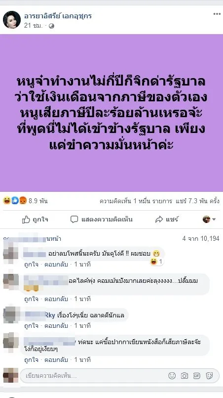 จากโพสต์ดังกล่าวสร้างความไม่พอใจให้กับผู้ใช้เฟซบุ๊กมากมาย จนเป็นเทรนด์ขึ้นทวิตกันเลย ซึ่งความคิดเห็นหนึ่งถามว่าผู้โพสต์ เสียภาษีถูกต้องเต็มเม็ดเต็มหน่วยหรือไม่ คำถามนี้เล่นเอาผู้โพสต์ถึงกับเซกันเลยทีเดียว