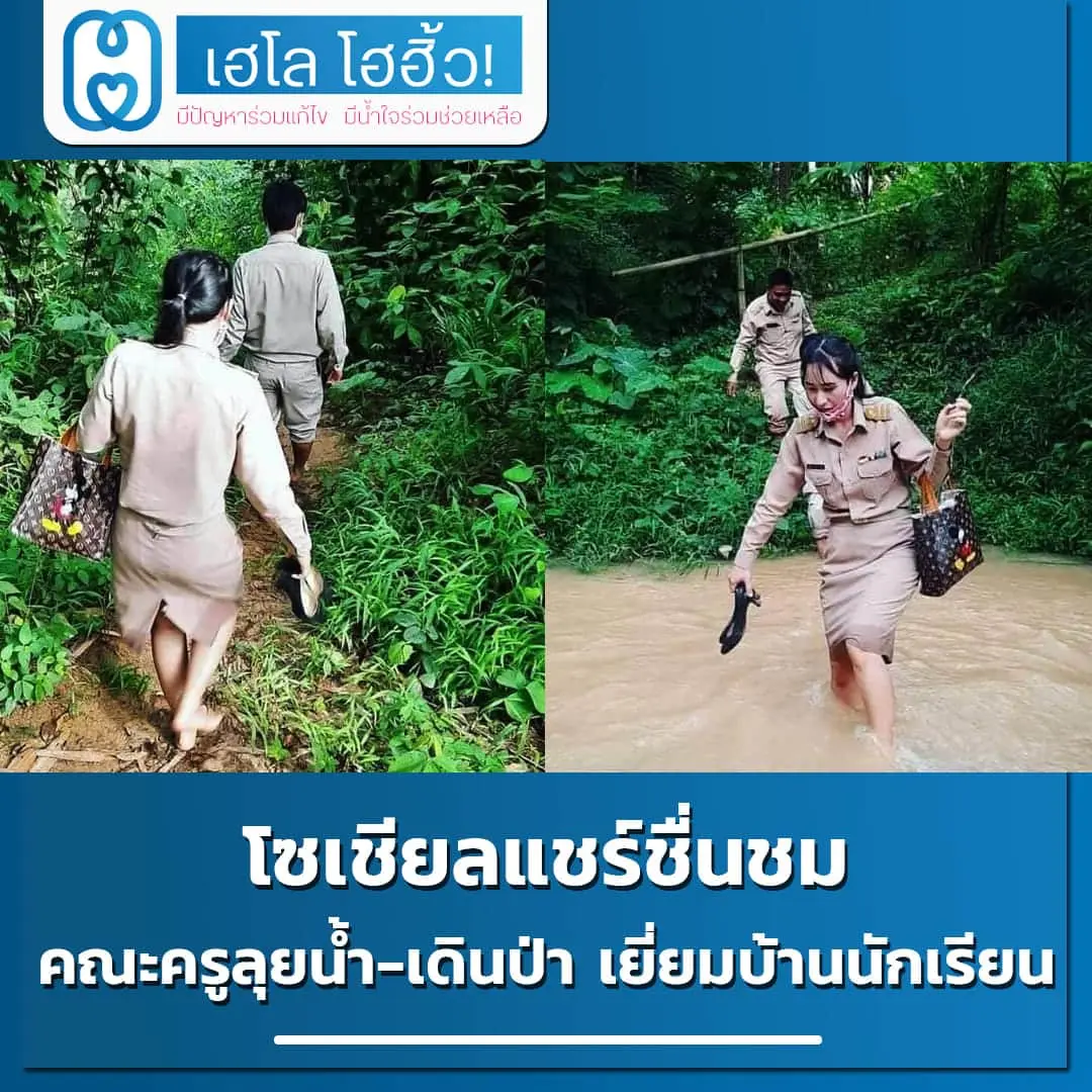 ทั้งนี้ ในภาพดังกล่าวจะเผยให้เห็นคณะครูผู้หญิง 1 คน และครูผู้ชาย 2 คน กำลังเดินทางอย่างยากลำบากลงน้ำ พร้อมกับเดินไปตามทางในป่า ต้องถอดรองเท้าเดินเพื่อไปเยี่ยมบ้านนักเรียนในพื้นที่ห่างไกล