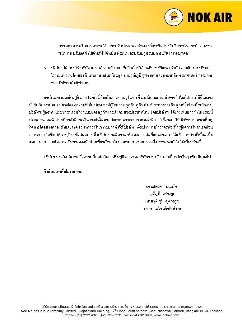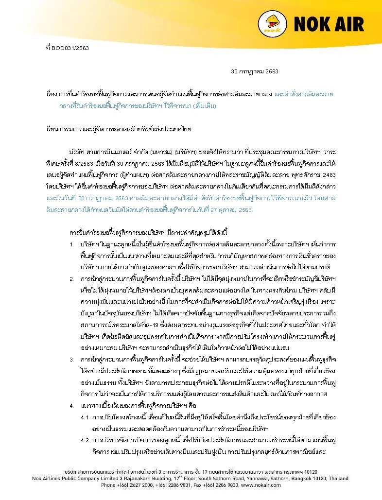 31 ก.ค. 2563 บริษัท สายการบินนกแอร์ จำกัด (มหาชน) แจ้งต่อตลาดหลักทรัพย์แห่งประเทศไทยว่า เมื่อวันที่ 30 กรกฎาคม 2563 ที่ประชุมคณะกรรมการบริษัทได้มีมติให้บริษัทยื่นคำร้องขอฟื้นฟูกิจการ และให้เสนอแผนฟื้นฟูกิจการต่อศาลล้มละลายกลางภายใต้พระราชบัญญัติล้มละลาย พุทธศักราช 2483