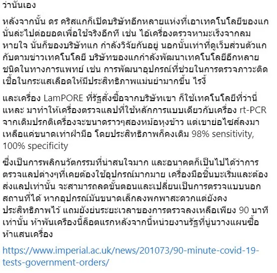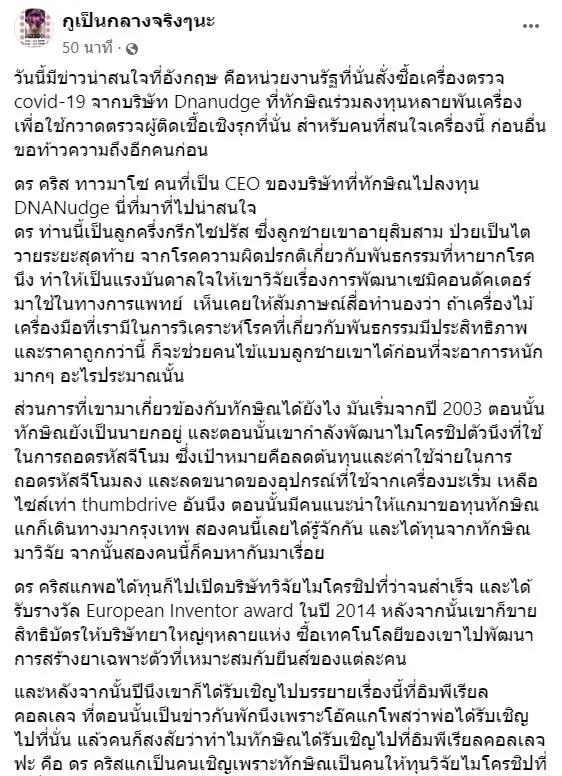 4 ส.ค. 2563 เฟซบุ๊ก Sirote Klampaiboon (ศิโรตม์ คล้ามไพบูลย์) นักวิชาการ และสื่อมวลชน พิธีกร รายการ Overview ทางช่อง Voice TV ได้รายงานว่า รัฐบาลสหราชอาณาจักร ซื้อเครื่องตรวจดีเอ็นเอของทักษิณเพื่อตรวจโควิด 5.8 ล้านชุด