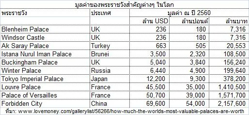 ผม (ดร.โสภณ พรโชคชัย) ในฐานะประธานศูนย์ข้อมูลวิจัยและประเมินค่าอสังหาริมทรัพย์ไทย (www.area.co.th) ซึ่งทำการประเมินค่าทรัพย์สินประเภทต่างๆ กล่าวว่าพระราชวังก็เป็นทรัพย์สินที่เป็นอสังหาริมทรัพย์ประเภทหนึ่ง แม้จะมีมูลค่าแต่ก็ไม่มีใครขาย เพราะถือเป็นสัญลักษณ์ของชาติประการหนึ่ง แต่ก็สามารถตีค่าเป็นเงินได้เช่นกัน เราประเมินกันอย่างไร ทั้งนี้ก่อนอื่นมาดูมูลค่าของพระราชวังสำคัญต่างๆ ทั่วโลกเพื่อการเปรียบเทียบเสียก่อน