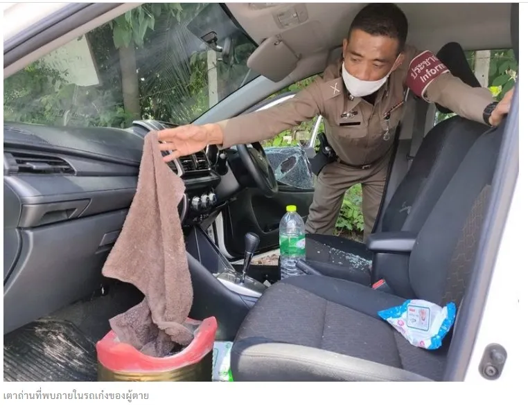 ที่เกิดเหตุพบรถเก๋ง ยี่ห้อโตโยต้า วีออส สีขาว มีการปิดกระจกแน่นหนาทั้ง 4 บาน ทำให้เจ้าหน้าที่ต้องทุบกระจกรถด้านข้างเพื่อเปิดประตูรถ โดยบริเวณที่นั่งคนขับพบศพ น.ส.ณี (นามสมมติ) อายุ 30 ปี พนักงานธนาคารแห่งหนึ่ง สภาพนั่งศีรษะและลำตัวเอนมาทางประตูรถ บริเวณที่วางเท้าด้านที่นั่งข้างคนขับพบอุปกรณ์ที่ใช้ในการรมควัน