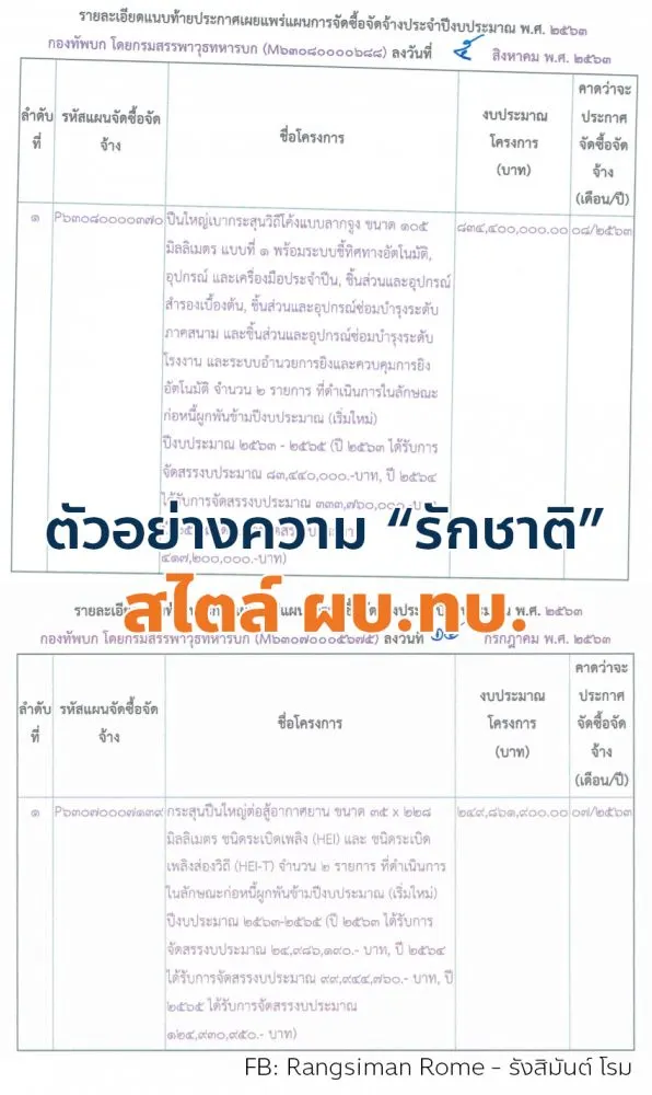 โดย รังสิมันต์ โรม ระบุว่า เรามาดูตัวอย่างความรักชาติในสไตล์ของ ผบ.ทบ. กันครับ เมื่อวานนี้ 5 สิงหาคม 2563 วันเดียวกับที่ พล.อ.อภิรัชต์ คงสมพงษ์ ผบ.ทบ. ออกมาเอื้อนเอ่ยวาทกรรม “โรคชังชาติรักษาไม่หาย” นั้น กองทัพบก โดยกรมสรรพาวุธทหารบก ได้ออกประกาศเผยแพร่แผนการจัดซื้อจัดจ้างประจำปีงบประมาณ 2563 มีรายการอย่างปืนใหญ่พร้อมอุปกรณ์ประกอบ จำนวน 2 รายการ เป็นวงเงินถึง 834.4 ล้านบาท หรือย้อนกลับไปเมื่อครึ่งเดือนที่แล้ว 15 กรกฎาคม 2563 กรมสรรพาวุธทหารบกก็เพิ่งประกาศแผนจัดซื้อกระสุนปืนใหญ่ต่อสู้อากาศยาน 2 รายการ 249.9 ล้านบาท