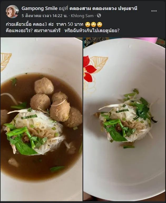 ผู้ใช้เฟซบุ๊กชื่อ Gampong Smile โพสต์ประจานก๋วยเตี๋ยวเนื้อ ราคา 50 บาท ดูแล้วน่าจะทานได้ประมาณ 1 คำ