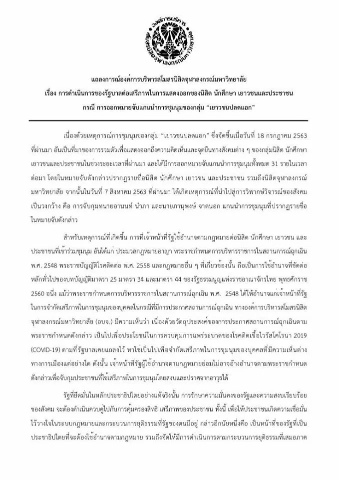 องค์การบริหารสโมสรนิสิตจุฬาลงกรณ์มหาวิทยาลัย (อบจ.) เผยแพร่แถลงการณ์ อบจ. เรื่อง การดำเนินการของรัฐบาลต่อเสรีภาพในการแสดงออกของนิสิต นักศึกษา เยาวชนและประชาชน กรณี การออกหมายจับแกนนำการชุมนุมของกลุ่ม "เยาวชนปลดแอก" โดยเรียกร้องให้รัฐบาลหยุดขัดขวางการใช้เสรีภาพการแสดงออกของนิสิต นักศึกษ เยาวชนและประชาชนทุกรูปแบบ ขอให้เคารพเสรีภาพการแสดงออก ปฏิบัติอย่างถูกต้องเป็นธรรม โดบบังคับใช้กฎหมายด้วยหลักคุณธรรมและสอดคล้องกับเจตนารมณ์ของกฎหมาย