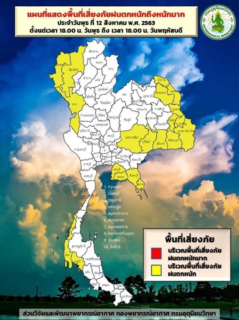 เว็บไซต์กรมอุตุฯ เผยแพร่ภาพพื้นที่เสี่ยงภัยฝนตกหนัก 22 จังหวัด โดยภาพแสดงพื้นที่เสี่ยงภัยฝนตกหนักตั้งแต่วันที่ 12 สิงหาคม 2563 เวลา 18.00น. ถึง 13 สิงหาคม 2563 เวลา 18.00น.