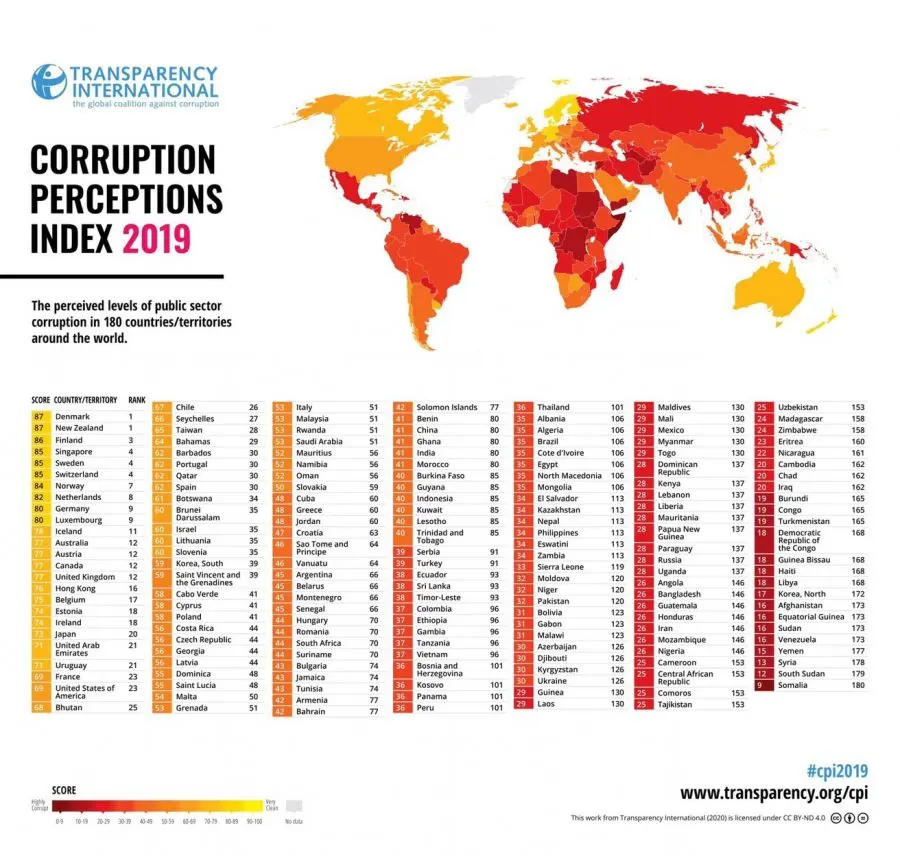 องค์การเพื่อความโปร่งใสนานาชาติ ( Transparency International) เผยแพร่ผล CPI ค่าดัชนีรับรู้การทุจริตประจำปี 2019 พบว่า ประเทศไทย ถูกจัดอยู่ในอันดับที่ 101 จากจำนวนทั้งหมด 180 ประเทศ และได้ค่าเฉลี่ยดัชนีที่ 36 (จากคะแนนเต็ม 100) ซึ่งเท่ากับค่าดัชนีในปี 2018 แต่อันดับถือว่าหล่นลง เนื่องจากในการจัดอันดับปี 2018 ไทยอยู่ในอันดับที่ 99 จาก 180 ประเทศ (ประเทศที่อันดับตัวเลขยิ่งสูงหมายถึงยิ่งมีการคอร์รัปชันมาก) ส่วนประเทศที่ถูกจัดอยู่ในอันดับ 1 ในปีนี้ มี 2 ประเทศได้อันดับ 1 ร่วมกันในฐานะประเทศที่มีการคอร์รัปชันน้อยที่สุด คือ นิวซีแลนด์และเดนมาร์ค (ได้ 87 คะแนนจาก 100 คะแนน) ขณะที่ประเทศที่ได้ชื่อว่าคอร์รัปชันมากที่สุด คือประเทศโซมาเลีย อยู่ในอันดับสุดท้ายของ 180 ประเทศ และได้ค่าดัชนี CPI เพียง 9 คะแนน (จากเต็ม 100)