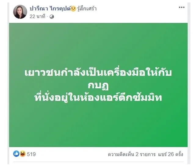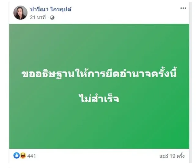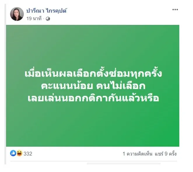 ถ้าไม่โพสต์นี่ผู้เขียนถือว่าแปลก 5555 ล่าสุด น.ส.ปารีณา ไกรคุปต์ ส.ส.ราชบุรี เขต 3 พรรคพลังประชารัฐ ได้โพสต์เฟซบุ๊กถึงการชุมนุมหลายโพสต์ เช่น “เยาวชนกำลังเป็นเครื่องมือให้กับกบฏ ที่นั่งอยู่ในห้องแอร์ตึกซัมมิท”, “ขออธิษฐานให้การยึดอำนาจครั้งนี้ไม่สำเร็จ”, “เมื่อเห็นผลเลือกตั้งซ่อมทุกครั้ง คะแนนน้อย คนไม่เลือก เลยเล่นนอกกติกากันแล้วหรือ” และ “วันนี้มีกลุ่มคนส่วนน้อย กำลังก่อ#กบฏ” เป็นต้น