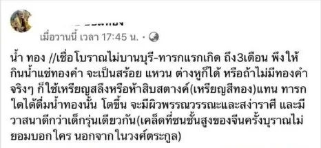 หลังจากที่ทางเพจ อยากดังเดี๋ยวจัดให้ Travel ได้มีการแชร์เรื่องราวเกี่ยวกับผู้ใช้เฟซบุ๊กที่มีการโพสต์ระบุเอาไว้ใจความว่า "ทารกแรกเกิดถึง 3 เดือน ให้กินน้ำแช่ทองคำ จะเป็นสร้อย แหวน ต่างหูก็ได้ หรือถ้าไม่มีทองคำจริง ๆ ก็ใช้เหรียญสลึงหรือเหรียญ 50 สตางค์ (เหรียญสีทอง) แทน ทารกที่ได้ดื่มจะโตขึ้น มีผิวพรรณวรรณะและสง่าราศี และมีวาสนาดีกว่าเด็กรุ่นเดียวกัน เป็นเคล็ดที่ชนชั้นสูงของจีน จนชาวเโซเชียลออกมาวิจารณ์กันอย่างหนักว่าเหมาะสมหรือไม่