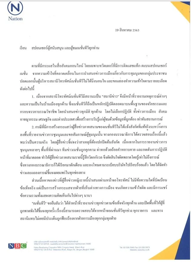 ตามที่มีกระแสในสื่อสังคมออนไลน์ โดยเฉพาะทวิตเตอร์ที่มีการติดแฮชแท็ก #แบนสปอนเซอร์เนชั่น จากความเข้าใจที่คลาดเคลื่อนในการนำเสนอข่าวการเมืองเกี่ยวกับการชุมนุมของกลุ่มประชาชนปลดแอกนั้น ผู้บริหารสถานีโทรทัศน์เนชั่นทีวีไม่ได้นิ่งนอนใจ และขอแถลงทำความเข้าใจตามรายละเอียดดังต่อไปนี้