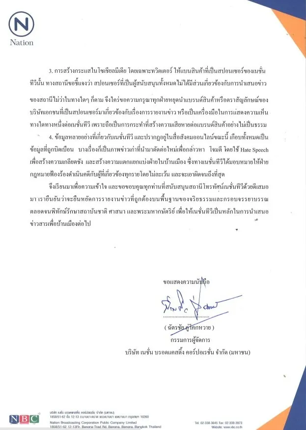 จึงเรียนมาเพื่อความเข้าใจ และขอขอบคุณทุกท่านที่สนับสนุนสถานีโทรทัศน์เนชั่นทีวีด้วยดีเสมอมา เรายืนยันว่าจะยืนหยัดการรายงานข่าวที่ถูกต้องบนพื้นฐานของจริยธรรมและกรอบจรรยาบรรณ ตลอดจนพิทักษ์รักษาสถาบันชาติ ศาสนา และพระมหากษัตริย์ เพื่อให้เนชั่นทีวีเป็นหลักในการนำเสนอข่าวสารเพื่อบ้านเมืองต่อไป