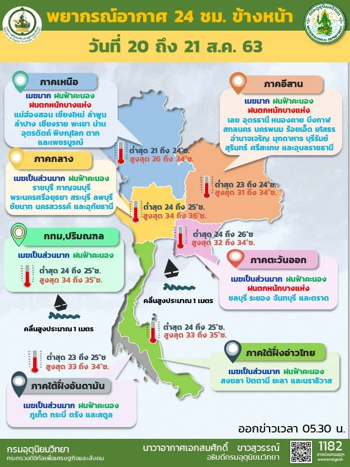 อนึ่ง ในช่วงวันที่ 20-23 สิงหาคม 2563 ร่องมรสุมจะเลื่อนลงมาพาดผ่านภาคเหนือ และภาคตะวันออกเฉียงเหนือตอนบน ทำให้ประเทศไทยตอนบนมีฝนเพิ่มมากขึ้นและมีฝนตกหนักบางแห่ง
