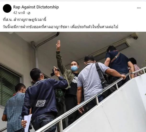 ตร.คุมตัว เดชาธร บำรุงเมือง หรือฮอคกี้ Hockhacker' ศิลปินวง Rap Against Dictatorship (RAD) เจ้าของบทเพลง “ประเทศกูมี” มาที่สน.สำราญราษฎร์ รับทราบข้อกล่าวหาชุมนุม 7 ข้อหา โดยเจ้าตัวยังชู 3 นิ้วให้กับคนที่มาให้กำลังใจ#หยุดคุกคามประชาชน pic.twitter.com/HSG4LruTLc