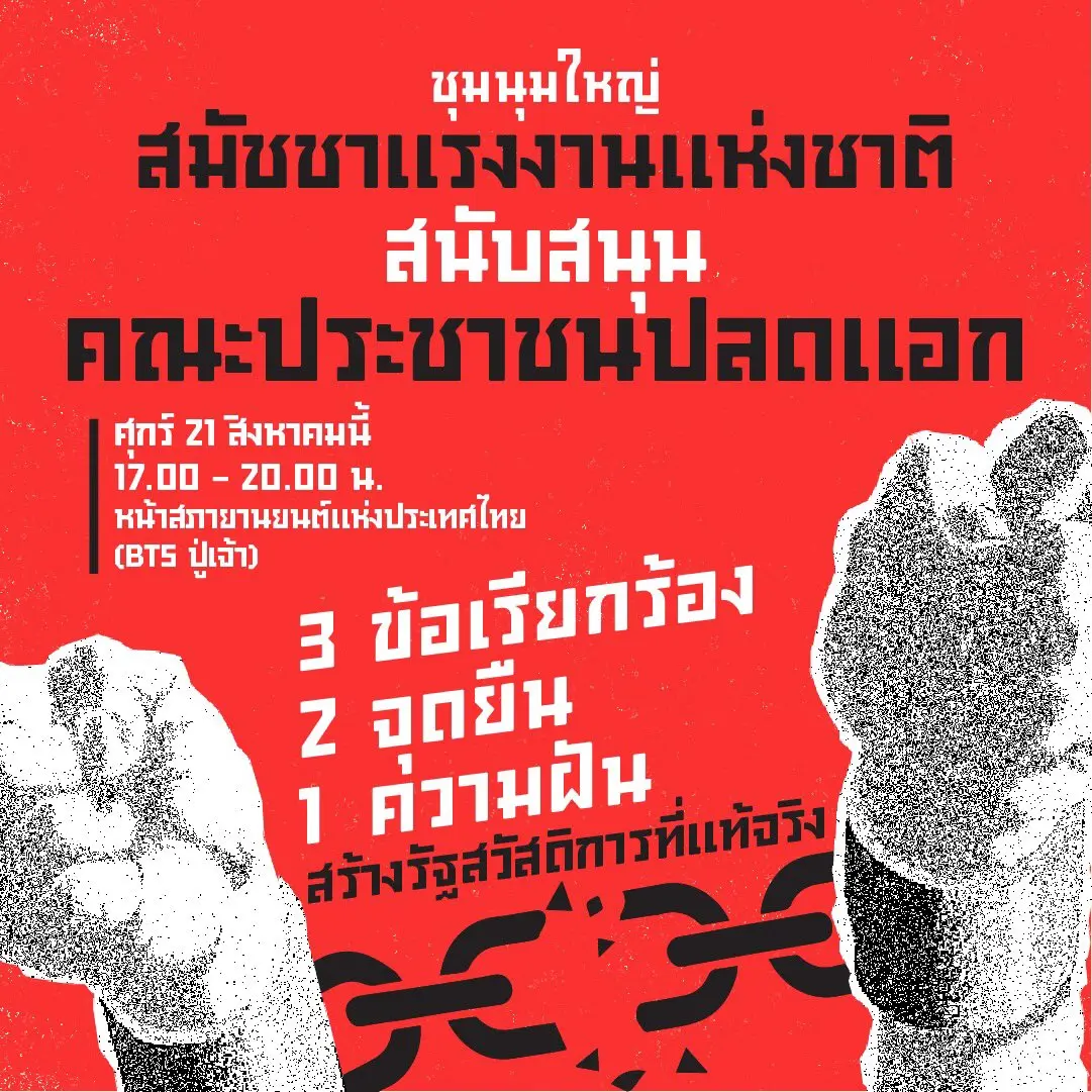 21 ส.ค.2563 ผู้สื่อข่าวรายงานว่า วันนี้ เมื่อเวลา 17.00 น. หน้าสำนักงานสภายานยนต์แห่งประเทศไทย BTS ปู่เจ้า จ.สมุทรปราการ สมัชชาแรงงานแห่งชาติ และเครือข่ายแรงงานต่อต้านการคุกคามประชาชน จำนวน 109 สหภาพฯ จึดกิจกรรมชุมนุม #แรงงานปฏิวัติ เพื่อสนับสนุน #ประชาชนปลดแอก โดยมีผู้ใช้แรงงานทั้งจากโรงงานอุตสาหกรรม อาชีพอิสระนักเรียนนักศึกษาผลัดกันขึ้นปราศรัยถึงปัญหาคุณภาพชีวิต ค่าแรง และเรียกร้องให้มีรัฐสวัสดิการ