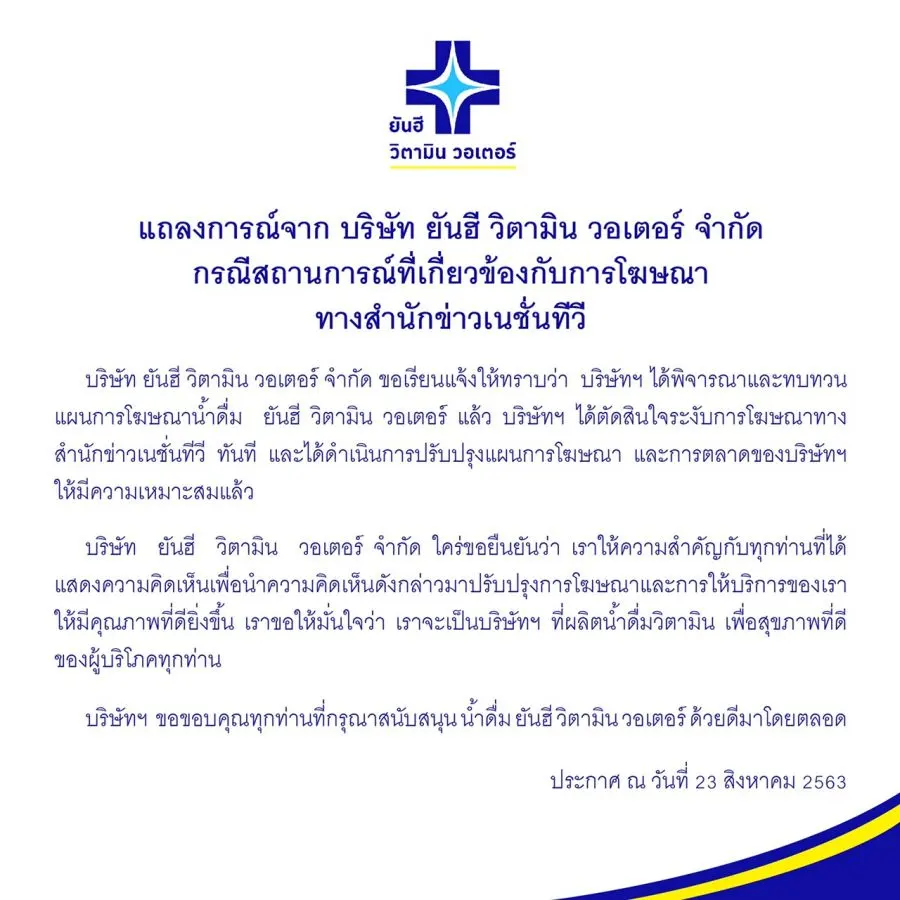 แถลงการณ์จาก บริษัท ยันฮี วิตามิน วอเตอร์ จำกัด กรณีสถานการณ์ที่เกี่ยวข้องกับการโฆษณาทางสำนักข่าวเนชั่นทีวี ประกาศ ณ วันที่ 23 สิงหาคม 2563 #ยันฮีวิตามินวอเตอร์