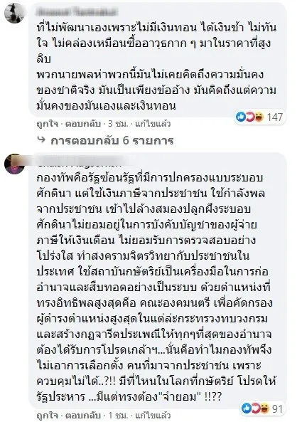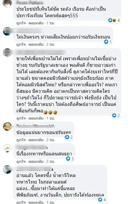 หรือ GT200 ที่ใช้ไม่ได้ เรือเหาะที่เหาะไม่ขึ้น ก็ขายให้กองทัพได้ เหลือแต่ห่อขี้ใส่ใบตองแล้วบอกว่าเป็นอาวุธชีวภาพ ที่ยังไม่เคยมีใครเสนอขาย แต่ถ้ามีเงินทอนดีๆก็ไม่แน่อาจขายได้ที่ยกตัวอย่างมากองทัพ ซื้อเศษเหล็กมาในราคาทองคำไม่นับเรื่องภาวะเศรษฐกิจที่ไม่ควรซื้อแล้วเรื่องที่เน้นซื้อ ไม่เน้นใช้งาน แต่เน้นราคาพิเศษใสไข่ เน้นเงินทอนก็เป็นเรื่องที่ต้องพิจารณากี่ยุคกี่สมัยว่า ทำไมกองทัพจึงไม่พัฒนาทำอาวุธมาใช้เอง สร้างอุตสาหกรรมป้องกันประเทศเอง ทำไมเน้นแต่ซื้อมาทิ้ง