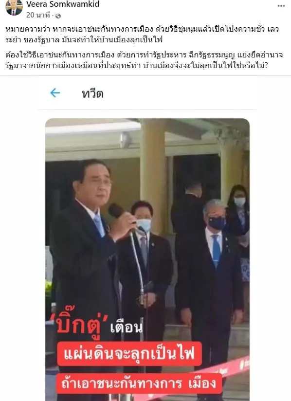 26 สิงหาคม 63 วาสนา นาน่วมผู้สื่อข่าวสายทหาร รายงาน ว่า “บิ๊กตู่” เตือน อย่าเอาชนะทางการเมืองแผ่นดินจะลุกเป็นไฟ ประเทศชาติมันล่มสลาย พ้อ! ผมก็สุดกำลังสติปัญญาของผมแล้วถ้าจะถึงตอนนั้นอีก ก็โอเคนะ! เตือน ความจำ “นายกฯเผด็จการ”เข้ามาเพราะอะไรให้คำมั่น ไม่ทุจริตเปรย งบฯถูกตัด ไม่ต้องเดินหน้ากัน