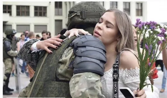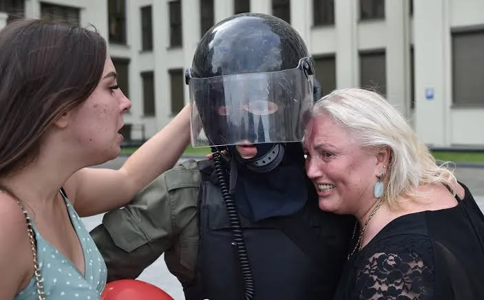 ผู้ชุมนุมเบลารุสโผเข้ากอดตำรวจปราบจลาจลด้วยความตื้นตัน หลังมีการลดโล่ลง จนถือเป็นการแสดงสัญญลักษณ์เป็นหนึ่งเดียวกับประชาชน ที่ยังปักหลักชุมนุมประท้วงขับไล่ปธน.ลูคาเชนโก