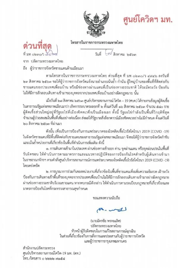 มท.สั่งด่วน ผู้ว่าฯ 10 จังหวัดชายแดนเมียนมา เข้มงวดป้องกัน #โควิด19 หลังรัฐยะไข่ระบาดหนัก