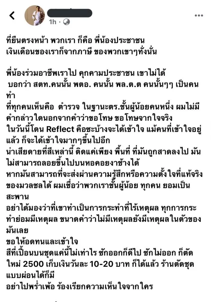 หนึ่งในตำรวจที่ถูกสาดสี กล่าวว่า “พี่น้องร่วมอาชีพเราไปคุกคามประชาชน ไม่มีคำกล่าวใดนอกจากขอโทษ แต่น่าเสียดายที่สีติดแค่พื้นที่ที่ถูกสาด ไม่สามารถไปถึงหอคอยงาช้างได้(พวกผู้นำ) ยังมองว่าเป็นการกระทำที่มีเหตุผล”