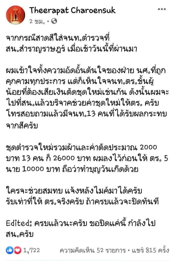 ส่วนด้านคุณ ธีรภัทร เจริญสุข ขอร่วมรับผิดชอบโดยระดมเงินซื้อชุดคืนให้ตำรวจ ซึ่งตอนนี้ก็ได้ครบจำนวนแล้ว เพราะรู้สึกไม่เห็นด้วยกับวิธีการนี้