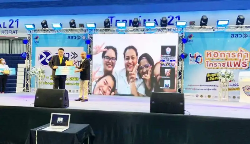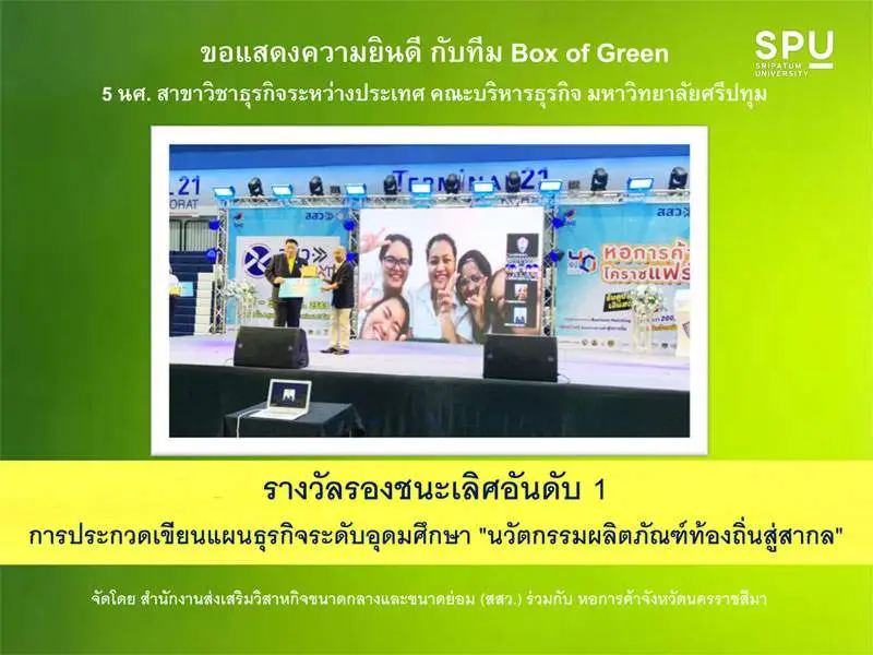 5 สาวเก่ง ทีม Box of Green จากรั้วบริหารธุรกิจ ม.ศรีปทุม โชว์ความรู้ความสามารถ คว้ารางวัลรองชนะเลิศอันดับที่1 ในการประกวดเขียนแผนธุรกิจ ระดับอุดมศึกษา "นวัตกรรมผลิตภัณฑ์ท้องถิ่นสู่สากล" ในงาน สสว. CONNEXT 40 ปี หอการค้าโคราชแฟร์
