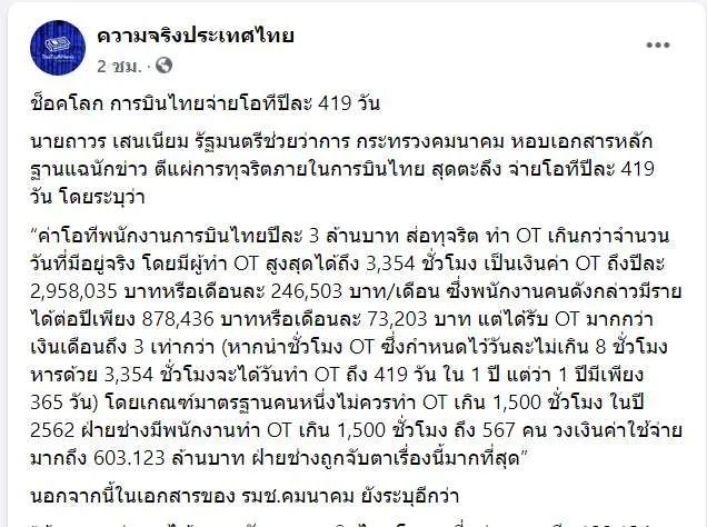 สุดช็อค เมื่อเพจ ความจริงประเทศไทย โพสต์ข่าว ช็อคโลก การบินไทยจ่ายโอทีปีละ 419 วัน วงเงินค่าใช้จ่ายมากถึง 603.123 ล้านบาท ฝ่ายช่างถูกจับตาเรื่องนี้มากที่สุด