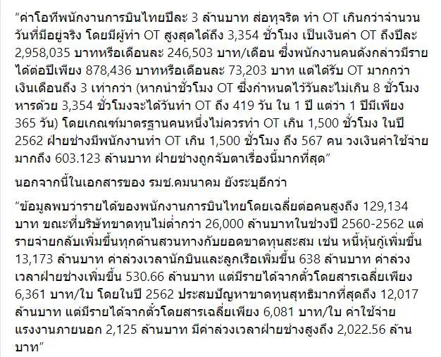“ค่าโอทีพนักงานการบินไทยปีละ 3 ล้านบาท ส่อทุจริต ทำ OT เกินกว่าจำนวนวันที่มีอยู่จริง โดยมีผู้ทำ OT สูงสุดได้ถึง 3,354 ชั่วโมง เป็นเงินค่า OT ถึงปีละ 2,958,035 บาทหรือเดือนละ 246,503 บาท/เดือน ซึ่งพนักงานคนดังกล่าวมีรายได้ต่อปีเพียง 878,436 บาทหรือเดือนละ 73,203 บาท แต่ได้รับ OT มากกว่าเงินเดือนถึง 3 เท่ากว่า (หากนำชั่วโมง OT ซึ่งกำหนดไว้วันละไม่เกิน 8 ชั่วโมง หารด้วย 3,354 ชั่วโมงจะได้วันทำ OT ถึง 419 วัน ใน 1 ปี แต่ว่า 1 ปีมีเพียง 365 วัน) โดยเกณฑ์มาตรฐานคนหนึ่งไม่ควรทำ OT เกิน 1,500 ชั่วโมง ในปี 2562 ฝ่ายช่างมีพนักงานทำ OT เกิน 1,500 ชั่วโมง ถึง 567 คน วงเงินค่าใช้จ่ายมากถึง 603.123 ล้านบาท ฝ่ายช่างถูกจับตาเรื่องนี้มากที่สุด”