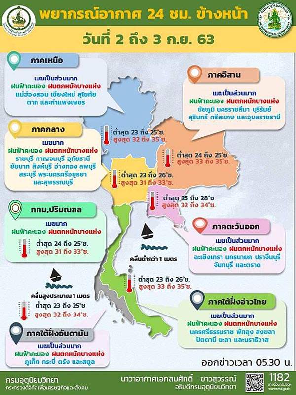 ภาคกลาง และภาคตะวันออกเฉียงเหนือ ประกอบกับมรสุมตะวันตกเฉียงใต้พัดปกคลุมทะเลอันดามัน ประเทศไทย และอ่าวไทย ขอให้ประชาชนบริเวณพื้นที่เสี่ยงภัย