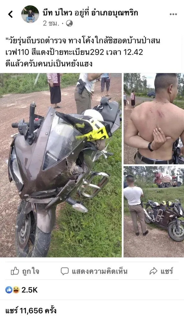 เฟซบุ๊ก “บีท บ่ไหว” โพสต์ภาพอุบัติเหตุของเจ้าหน้าที่ตำรวจหล่อล่ำ โดนวัยรุ่นถีบจักรยานยนต์จนล้มพังเสียหายยับเยิน บริเวณทางโค้งบ้านป่าสนอำเภอบุณฑริก จังหวัดอุบลราชธานี เเผยลักษณะผู้ก่อเหตุขับขี่จักรยานยนต์ฮอนด้า เวฟ 110 สีแดง ป้ายทะเบียน 292 โดยมีเนื้อหาโพสต์ว่า “วัยรุ่นถีบรถตำรวจ ทางโค้งใกล้ชิฮอดบ้านป่าสน เวฟ 110 สีแดง ป้ายทะเบียน 292 เวลา 12.42 ดีแล้วครับคนบ่เป็นหยังแฮง” อย่างไรก็ตาม ตำรวจหล่อล่ำได้เปิดโชว์แผ่นหลังแน่นๆขาวๆให้ชาวเน็ตได้ดูเป็นบุญตา เพื่อโชว์แผลบาดเจ็บ ทำเอาเห็นแล้ว เจ็บแทนเลยทีเดียว ส่วนวัยรุ่นที่คึกคะนองจนกล้าทำร้ายเจ้าหน้าที่ตำรวจคงซวยแน่ เพราะเจ้าหน้าที่ตำรวจจำทะเบียนได้ โพสต์มียอดกดไลก์ถึง 2,500 ครั้งด้วยกัน ล่าสุดผู้โพสต์ได้ลบโพสต์แล้ว