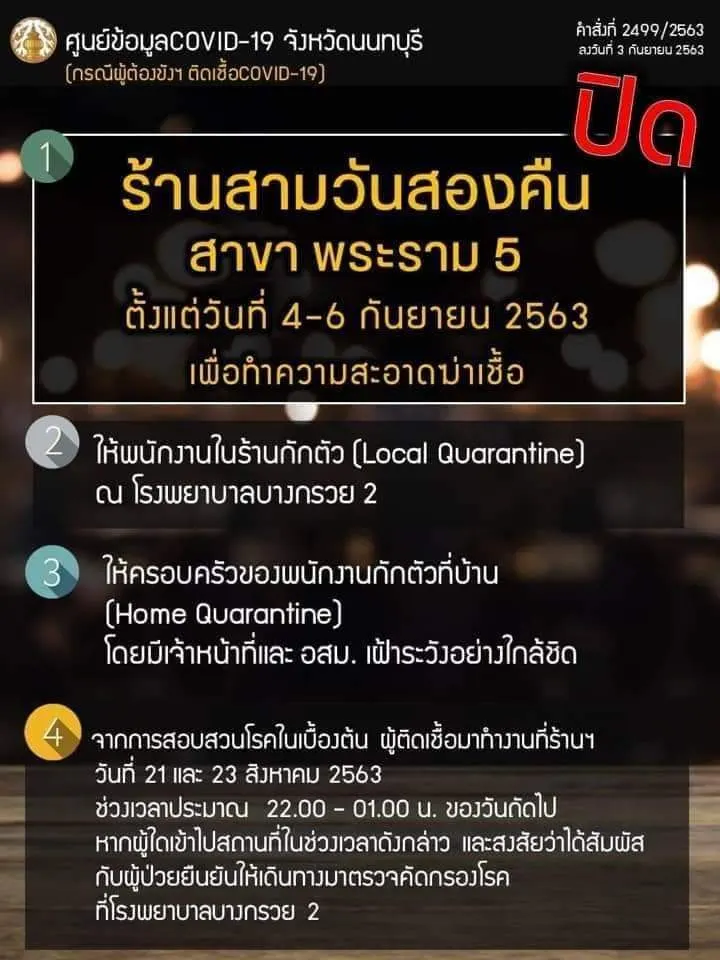 สั่งปิดสถานที่เป็นการชั่วคราว ร้านสามวันสองคืน สาขาพระราม 5 หลังพบผู้ป่วยติดโควิด 19 ในรอบ 101 วัน