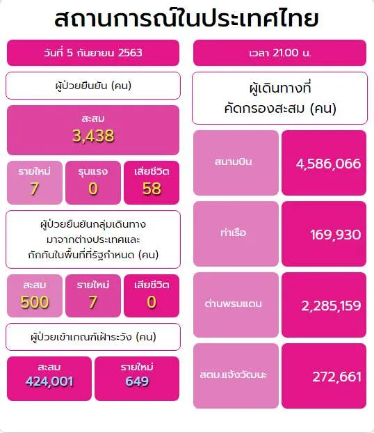 ล่าสุด สถานการณ์การแพร่ระบาดของโรคติดเชื้อไวรัสโคโรนา 2019 (COVID-19) หรือ โควิด-19 ในไทยวันนี้ (6 ก.ย.) พบผู้ติดเชื้อรายใหม่เพิ่ม 6 ราย และเข้า State Quarantine จากสหรัฐอเมริกา 2 ราย สหราชอาณาจักร 1 ราย และสิงคโปร์ 3 ราย