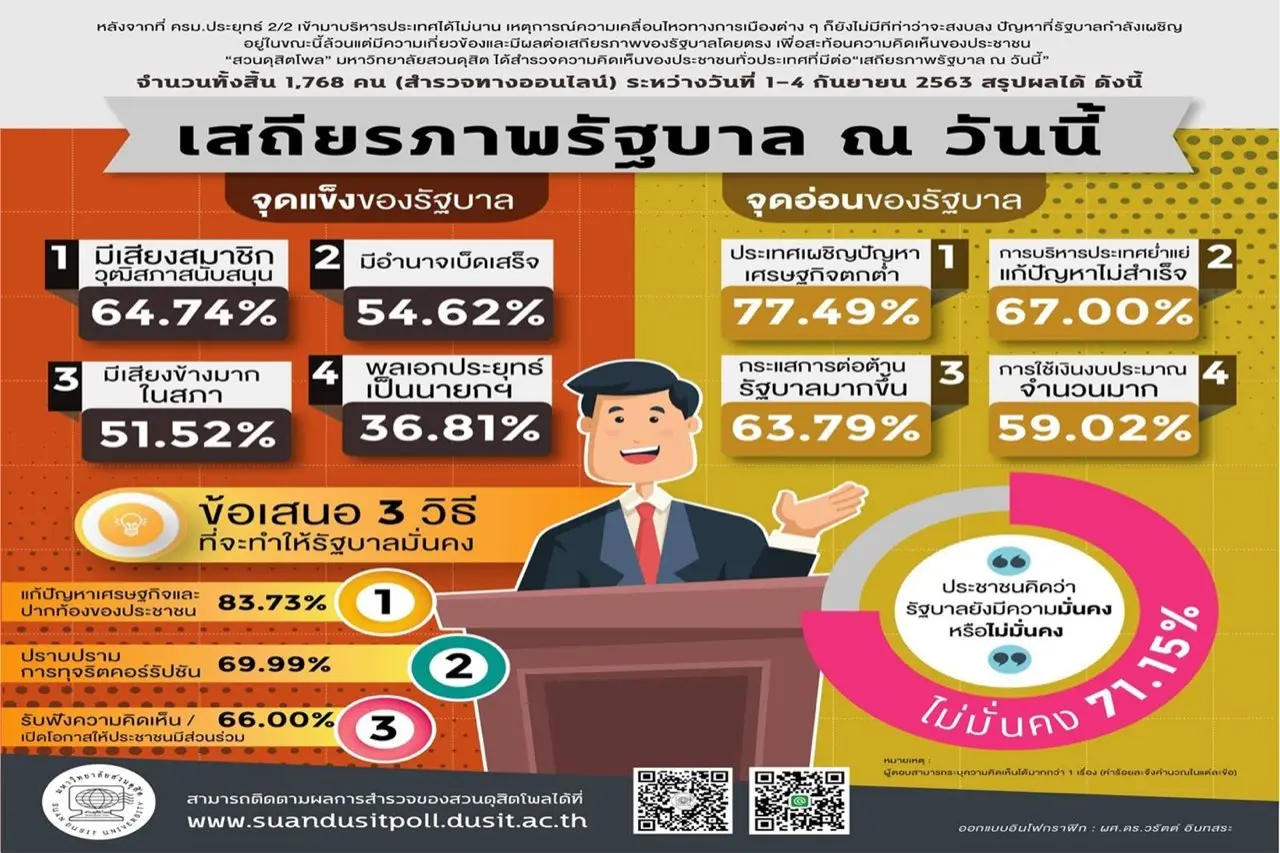 สวนดุสิตโพล มหาวิทยาลัยสวนดุสิต เปิดเผยผลสำรวจความคิดเห็นเรื่อง "เสถียรภาพรัฐบาล ณ วันนี้" โดยสำรวจกลุ่มตัวอย่าง จำนวนทั้งสิ้น 1,768 คน (สำรวจทางออนไลน์) ระหว่างวันที่ 1-4 ก.ย. 2563 เพื่อสะท้อนความคิดเห็นหลังจากที่ ครม.ประยุทธ์ 2/2 เข้ามาบริหารประเทศได้ไม่นาน เหตุการณ์ความเคลื่อนไหวทางการเมืองต่าง ๆ ก็ยังไม่มีทีท่าว่าจะสงบลง ปัญหาที่รัฐบาลกำลังเผชิญอยู่ในขณะนี้ล้วนแต่มีความเกี่ยวข้องและมีผลต่อเสถียรภาพของรัฐบาลโดยตรง