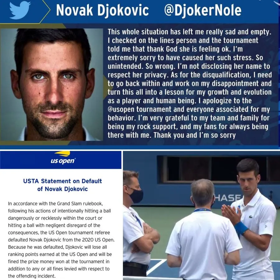 “โนวัค โยโควิช” นักเทนนิสมือของ 1 โลก ถูกปรับแพ้ ในศึกเทนนิสยูเอสโอเพ่น หลังใช้ไม้ตีคืนลูกเทนนิส แต่พลาดไปโดนผู้กำกับเส้นหญิง