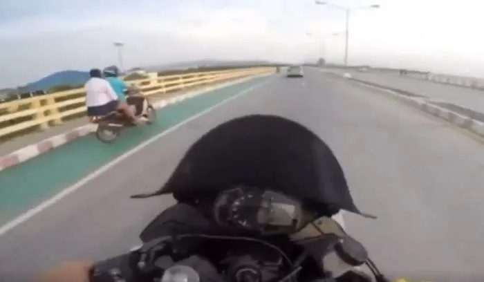 ใคคลิปสตาร์ทบิดแรงด้วยความเร็วสูงบริเวณ สะพานใหม่เมืองชลฯ ฟังเสียงรถแล้วมีพลังขึ้นทันใด ไปสุดอะไรก็ฉุดไม่อยู่ สุดท้ายควบคุมรถไม่ได้เฉี่ยวชนชาวบ้านที่วิ่งออกกำลังกายริมฟุตบาท บาดเจ็บไปหลายคน กลิ้งหลายตลบ ลงไปนอนแน่นิ่งกองกับพิ้นอย่างสมใจ