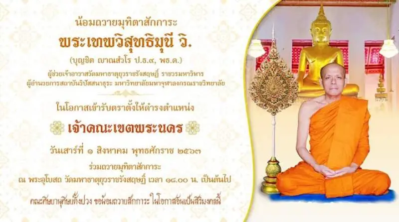 พ.ศ. ๒๕๖๒ พระราชาคณะชั้นเทพ ฝ่ายวิปัสสนาวิธีวรนายก ตรีปิฎกบัณฑิต มหาคณิสสร บวรสังฆาราม คามวาสี" ในราชทินนาม พระเทพวิสุทธิมุนี วิ.