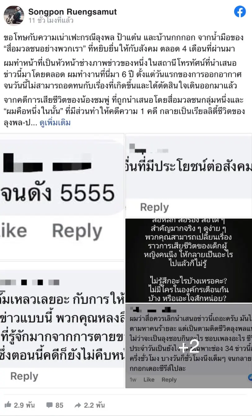 จากกรณี มีผู้ใช้เฟซบุ๊กรายหนึ่ง ซึ่งเป็นหัวหน้าช่างภาพสถานีโทรทัศน์แห่งหนึ่ง ได้โพสต์ข้อความระบายผ่านเฟซบุ๊กส่วนตัวเกี่ยวกับการนำเสนอข่าว ลุงพล ของ น้องชมพู่ หรือ นายไชย์พล วิภา ซึ่งกำลังถูกพูดถึงอย่างมากในโซเชียลมีเดีย ด้วยข้อความ “ขอโทษกับความเน่าเฟะกรณีลุงพล ป้าแต๋น และบ้านกกกอก จากน้ำมือของ “สื่อมวลชนอย่างพวกเรา” และ ขอลาออกจากงาน