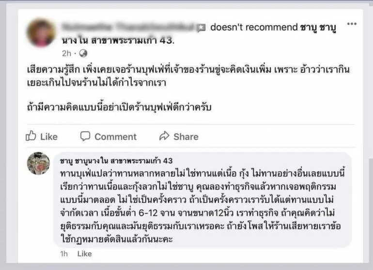 ทางร้านชาบูได้มาตอบคอมเม้นต์ดังกล่าว"ทานบุเฟ่แปลว่าทานหลากหลายไม่ใช่ทานแต่เนื้อ กุ้ง ไม่ทานอย่างอื่นเลยแบบนี้เรียกว่าทานเนื้อและกุ้งลวกไม่ใช่ชาบู คุณลองทำธุรกิจแล้วหากเจอพฤติกรรมแบบนี้มาตลอด ไม่ใช่เป็นครั้งคราว ถ้าเป็นครั้งคราวเรารับได้แต่ทานแบบไม่จำกัดเวลา เนื้อขั้นต่ำ 6-12 จาน จานขนาด12นิ้ว เราทำธุรกิจ ถ้าคุณคิดว่าไม่ยุติธรรมกับคุณและมันยุติธรรมกับเราเหรอคะ ถ้ายังโพสให้ร้านเสียหายเราข้อใช้กฏหมายตัดสินแล้วกันนะคะ”
