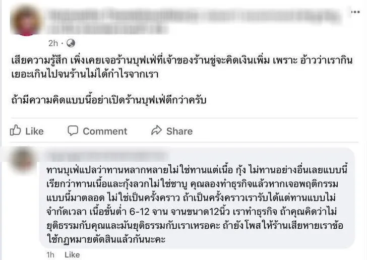 "ผมเข้าใจว่าการทำร้านบุฟเฟ่นั้นสิ่งที่ควรให้ความสำคัญคือลูกค้า ถ้าคุณไม่พร้อมจะเปิดให้บริการ และการที่มาข่มขูลูกค้าแบบนี้ ผมมองว่าไม่เป็นธรรม"