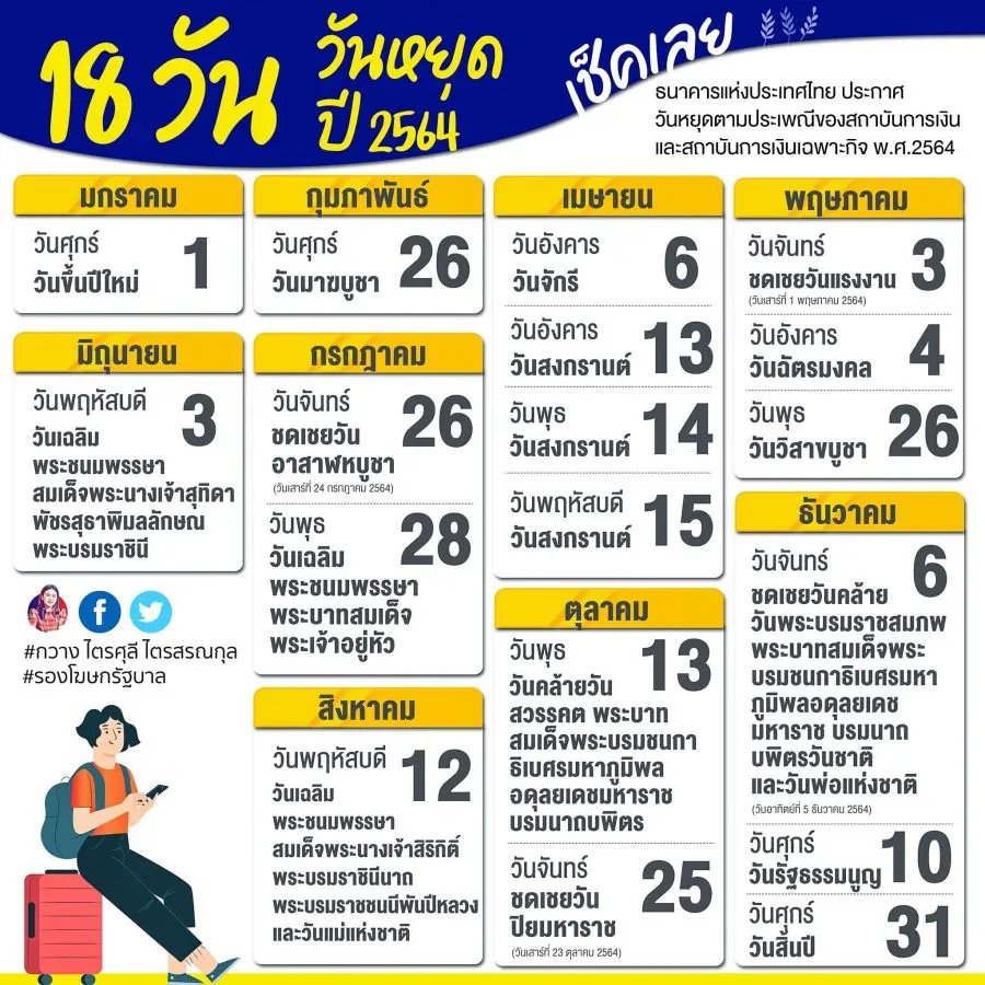 ธนาคารแห่งประเทศไทย(ธปท.) ประกาศ วันหยุดตามประเพณีของสถาบันการเงินและสถาบันการเงินเฉพาะกิจ พ.ศ.2564 จำนวน 18 วัน ดังนี้