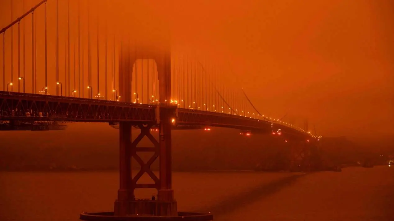 ชาวอเมริกันในย่านเบย์ แอเรีย ในนครซานฟรานซิสโก รัฐแคลิฟอร์เนีย ต้องตกตะลึง เมื่อเห็นท้องฟ้าในวันที่ 9 ก.ย. 63 แปรเปลี่ยนเป็นสีส้มเต็มโค้งขอบฟ้า อย่างกับสภาพหฤโหดที่เห็นบนดาวอังคาร กระแสลมพากลิ่นควันไฟลอยมาถึง ทั้งที่อยู่ห่างจากบริเวณที่เกิดไฟไหม้ป่ากว่า 300 กิโลเมตร