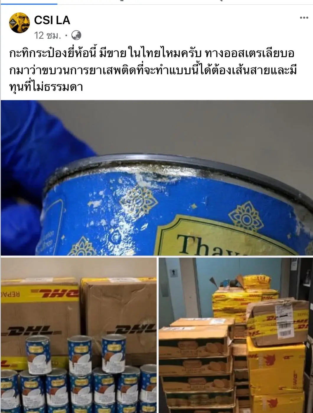รายงานระบุว่าเจ้าหน้าที่กองกำลังตรวจคนเข้าเมืองออสเตรเลีย หรือ เอบีเอฟ ได้ตรวจพบ สินค้าเป็นกระป๋องกระทิยี่ห้อหนึ่งที่ถูกส่งมาจากประเทศไทยไปยังนครซิดนีย์ จำนวน 86 กระป๋อง ก่อนการสุ่มตรวจของเหลว ภายในพบว่าเป็นสารเมตแอมเฟตามีน โดยมีการคาดว่าภายในมีสารเสพติดบรรจุอยู่จำนวนมากถึง 600 ลิตร
