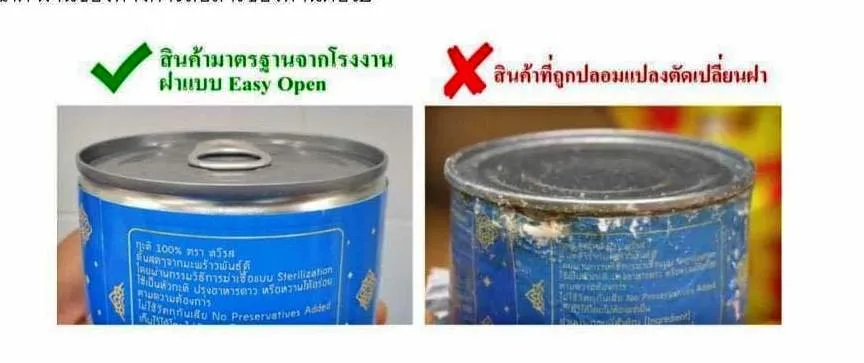 2.กระป๋องที่ปรากฎในข่าวมีสภาพที่แตกต่างจากมาตรฐานการผลิตของบริษัท และมีร่องรอยการ ถูกดัดแปลงอย่างชัดเจน โดยเฉพาะลักษณะฝามาตรฐานเป็นฝาที่ดึงเปิดได้ง่าย (Easy Open Ends) แต่กระป๋องที่ปรากฎในข่าวเป็นฝาปิดที่มีลักษณะแตกต่างออกไป
