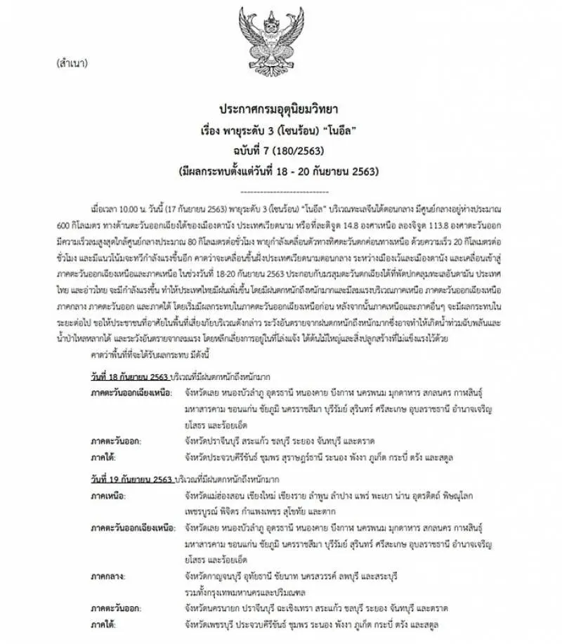 กรมอุตุนิยมวิทยา ได้ออกมาเผยประกาศ เรื่อง พายุระดับ 3 (โซนร้อน) โนอึล (มีผลกระทบตั้งแต่วันที่ 18-20 กันยายน 2563) ฉบับที่ 7 เมื่อเวลา 10.00 น. พายุระดับ 3 (โซนร้อน) โนอึล บริเวณทะเลจีนใต้ตอนกลาง มีศูนย์กลางอยู่ห่างประมาณ 600 กิโลเมตร ทางด้านตะวันออกเฉียงใต้ของเมืองดานัง ประเทศเวียดนาม หรือที่ละติจูด 14.8 องศาเหนือ ลองจิจูด 113.8 องศาตะวันออก มีความเร็วลมสูงสุดใกล้ศูนย์กลางประมาณ 80 กิโลเมตรต่อชั่วโมง