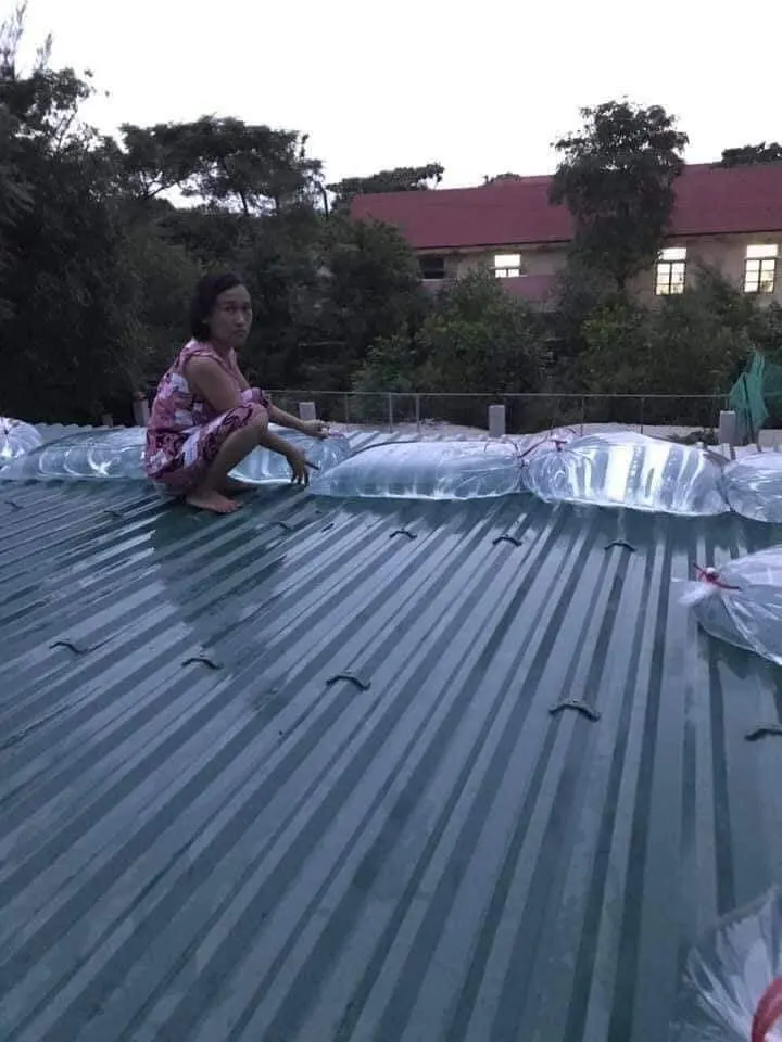 #ชาวเวียดนามใช้ถุงบรรจุน้ำ ทับบนหลังคาบ้านเพื่อเพิ่มน้ำหนัก ป้องกันแรงลมพัดหลังคาปลิว จากพายุโนอึล