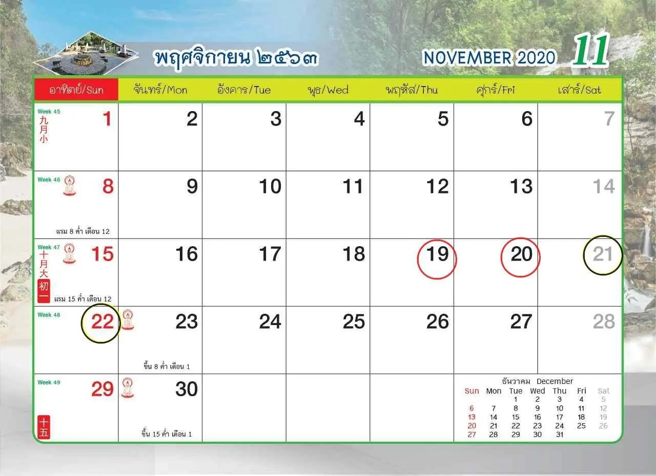 22 ก.ย .63 ผู้สื่อข่าวรายงานว่า ที่ประชุมคณะรัฐมนตรี (ครม.) ที่มี พล.อ.ประยุทธ์ จันทร์โอชา นายกรัฐมนตรี และรัฐมนตรีว่าการกระทรวงกลาโหม เป็นประธาน มีมติเห็นชอบประกาศให้วันพฤหัสบดีที่ 19 พ.ย.และวันศุกร์ที่ 20 พ.ย. เป็นวันหยุดเพิ่มเติม เพื่อให้ต่อเนื่องกับวันหยุดเสาร์-อาทิตย์ ดังนั้น จึงเท่ากับเป็นการหยุดต่อเนื่อง 4 วัน คือวันที่ 19-22 พ.ย.63