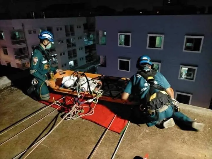 กู้ภัย แชร์ภาพเคลื่อนย้ายศพแบบทุลักทุเล ต้องโรยตัวจากชั้นดาดฟ้ามายังพื้นด้านล่าง