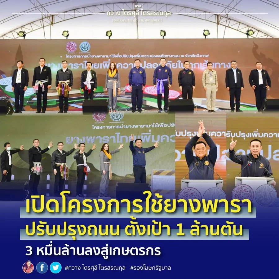 นายอนุทิน ชาญวีรกูล รองนายกรัฐมนตรีและ รมว.กลาโหม เป็นประธานพิธีเปิดโครงการนำยางพารามาใช้เพื่อปรับปรุงเพิ่มความปลอดภัยทางถนน เมื่อวันที่ 26 กันยายน 2563 ณ บริเวณถนนสาย 222 ตอนท่ากกแดง – บึงกาฬ กม.125+330 – 126+700 อ.เมือง จ.บึงกาฬ โดยมี นายศักดิ์สยาม ชิดชอบ รมว.คมนาคม นายชัยวัฒน์ ทองคำคูณ ปลัดกระทรวงคมนาคม นายสราวุธ ทรงศิวิไล อธิบดีกรมทางหลวง นายปฐม เฉลยวาเรศ อธิบดีกรมทางหลวงชนบท นายชยธรรม์ พรหมศร ผู้อำนวยการสำนักงานนโยบายและแผนการขนส่งและจราจร ผู้บริหารระดับสูงและหัวหน้าหน่วยงานในสังกัดกระทรวงคมนาคม กระทรวงมหาดไทย กระทรวงเกษตรและสหกรณ์ ร่วมพิธี