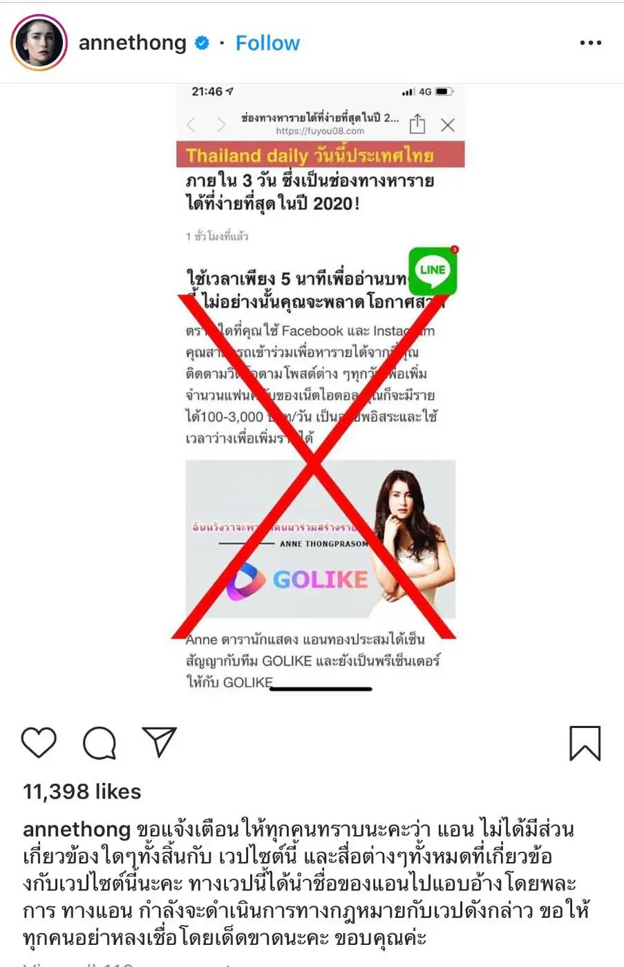 ถึงกับออกอาการ เมื่อนางเอกชื่อดัง แอน ทองประสม โพสกลางไอจี ว่ามีเพจหารายได้ออนไลน์ ได้นำรูปของตนไปแอบอ้าง พร้อมข้อความอันเป็นเท็จ "Anne ดารานักแสดง แอนทองประสมได้เซ็นสัญญา กับทีม GOLIKE และ ยังเป็นพรีเซ็นเตอร์ให้กับ GOLIKE"